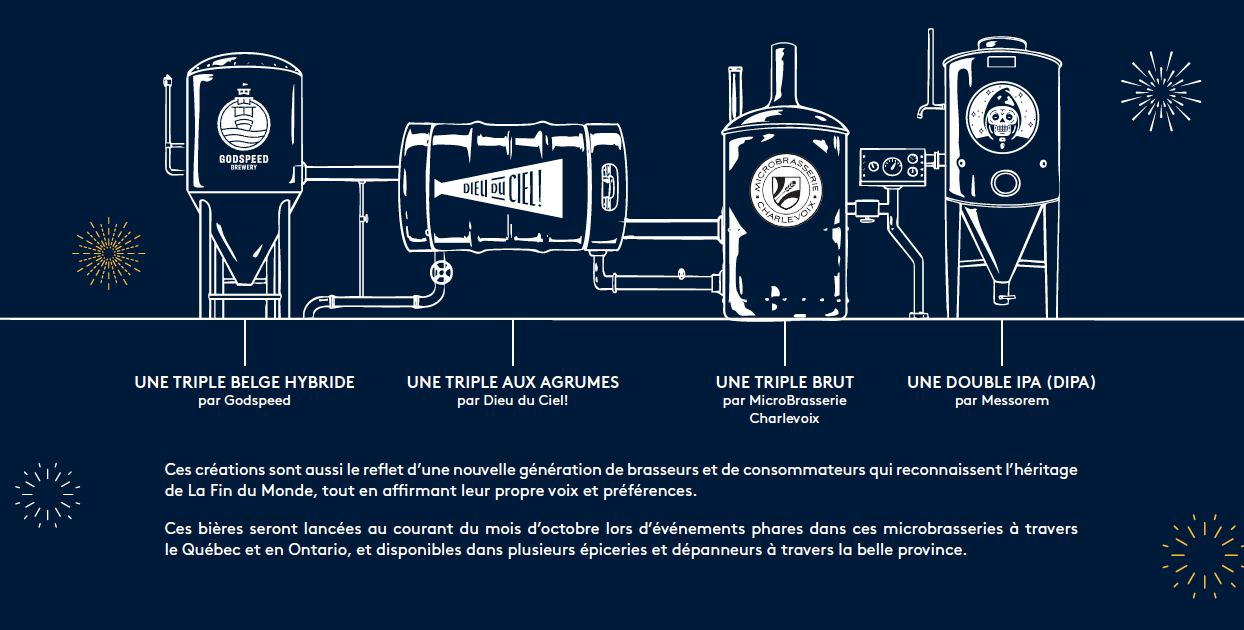 Pour souligner l’influence de La Fin du Monde sur la scène brassicole québécoise, Unibroue s’est associée à quatre microbrasseries : Dieu du Ciel!, Messorem, MicroBrasserie Charlevoix et Godspeed. Chacune a créé un brassin hommage à sa manière, en puisant dans son identité pour réinterpréter leur vision de La Fin du Monde.