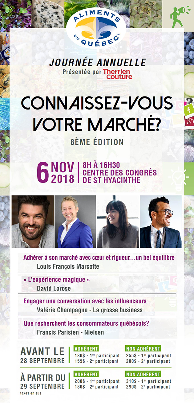 Aliments du Québec invite les entreprises adhérentes à sa table, le 6 novembre 2018 au Centre des congrès de St-Hyacinthe! Une journée de conférences inspirantes et éclairées sur des sujets d’actualité.