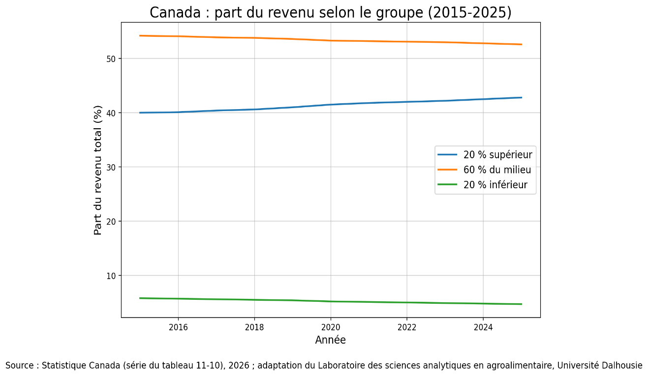 Au cours de la dernière décennie, la répartition des revenus au Canada a évolué de manière discrète, mais significative. Selon Statistique Canada, la part du revenu total détenue par les 20 % les plus riches est passée d’environ 40 % en 2015 à près de 43 % en 2025. À l’inverse, celle des 20 % les plus modestes a reculé, passant d’environ 5,6 % à moins de 5 %. Résultat : la classe moyenne — ce 60 % central qui a longtemps soutenu la demande — s’effrite.