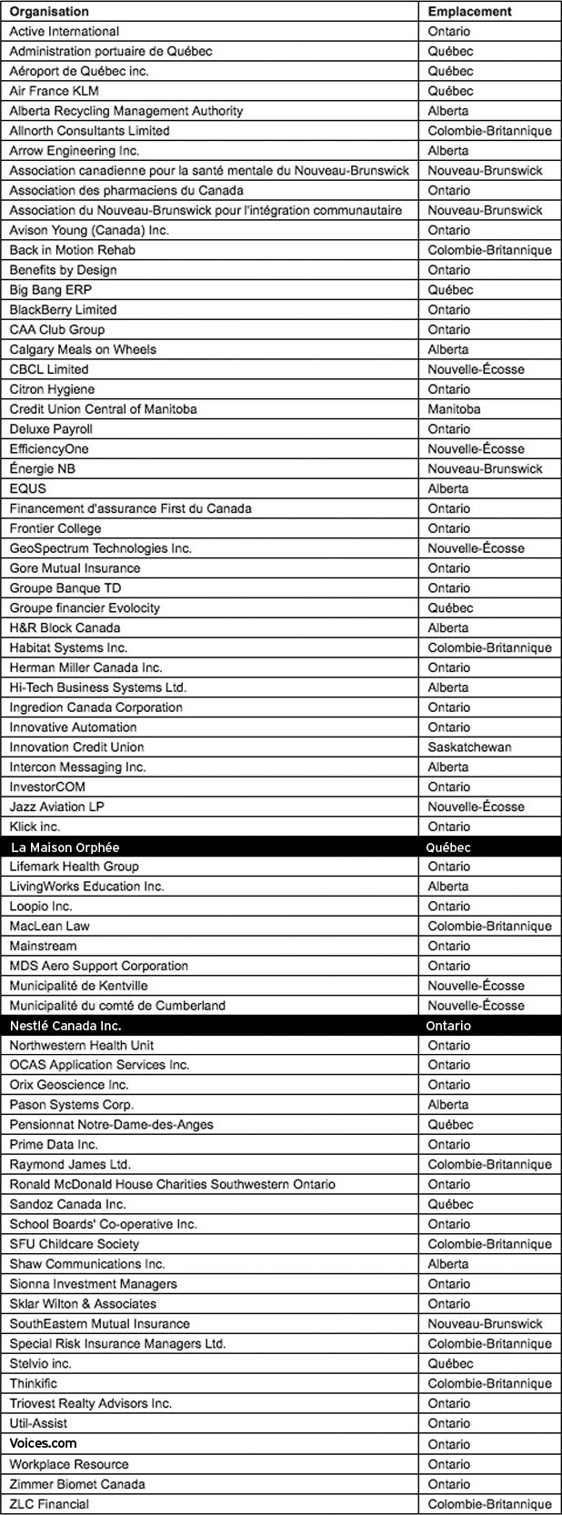 La liste des 75 milieux de travail d’exception pour 2019 figure ci-après.