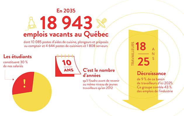 Sachant que 43% des emplois dans les services de restauration sont occupés par des personnes âgées de moins de 25 ans, la situation est très inquiétante. En effet, on prévoit une décroissance importante de 9% de ce bassin de travailleurs d’ici 2025.