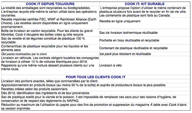 L’entreprise québécoise de boîtes de prêt-à-cuisiner Cook it lance un projet-pilote afin de réduire au maximum son empreinte écologique. En plus de poursuivre sa mission de limiter le gaspillage alimentaire, Cook it s’engage à offrir, dès la fin novembre, un kit durable permettant notamment d’utiliser les mêmes contenants plusieurs fois avant de les recycler en fin de vie utile. Elle vise à offrir ce nouveau service d’ici deux ans à l’ensemble de ses marchés.