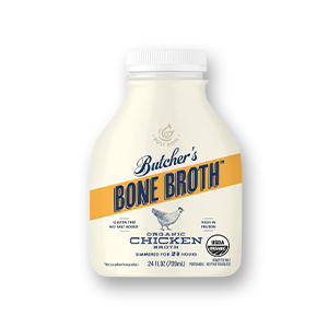 Jamais congelés, les bouillons d’os biologiques Butcher’s sont préparés en utilisant des os et des carottes biologiques ainsi que de l’eau filtrée. Ce produit est destiné au grand public, mais aussi à ceux qui pratiquent les régimes paléo et kéto.Chez Costco, deux bouteilles de 24 oz de bouillon de poulet Butcher’s de Roli Roti se vendent au prix de 8,99 $US.