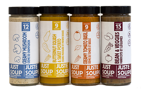 Just Soup est une ligne de soupe entièrement naturelle, sans gluten, sans liants synthétiques et fabriquée à partir de vinaigre de cidre de pomme.