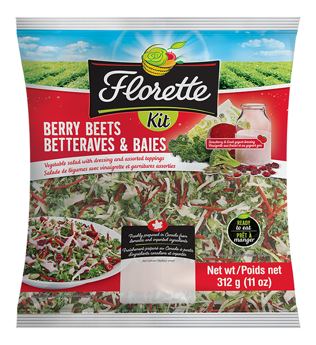 Florette lance le mélange Betteraves et baies est composé de chou vert, de betteraves rouges, de chou frisé, de brocoli, de graines de citrouille, de canneberges séchées ainsi que d’une vinaigrette aux fraises et au yogourt grec.
