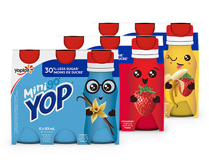 Yoplait ajoute un petit nouveau dans sa famille de yogourts à boire Yop avec son nouveau Mini Yop. Celui-ci est conçu avec du lait entier canadien comme premier ingrédient (le seul sur le marché).