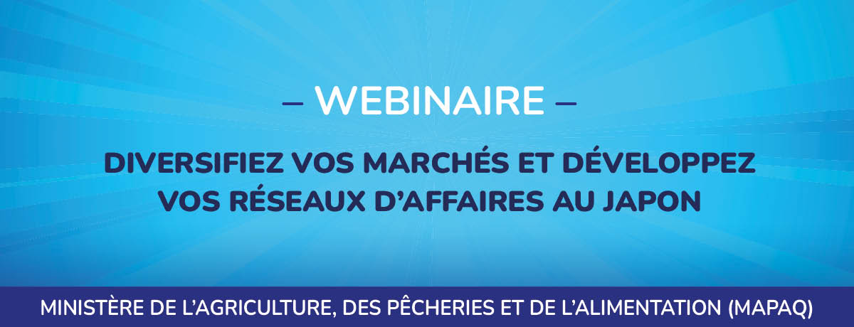 La Délégation générale du Québec à Tokyo, en collaboration avec le ministère de l’Agriculture, des Pêcheries et de l’Alimentation, vous invitent à participer au webinaire Diversifiez vos marchés et développer vos réseaux d’affaires au Japon.