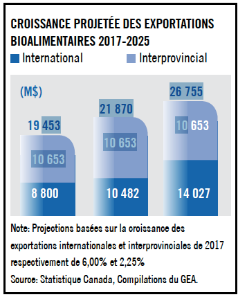 Alors, atteindre 14 milliards en 2025, comme souhaité dans cette politique ; est-ce possible? Plusieurs économistes estiment présentement que, d’ici 2025, les exportations hors Canada atteindront effectivement les 14 milliards de dollars, allant même jusqu’à dépasser les ventes interprovinciales, pour des ventes totales projetées atteignant plus de 26,7 milliards.