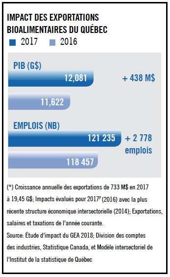 À n’en point douter, les exportations représentent des occasions en or pour les entreprises, mais à plus grande échelle, force est de constater que la société québécoise tout entière en bénéficie. En 2017, les exportations bioalimentaires au Québec ont ajouté 12,1 milliards de dollars au PIB provincial et ont généré au-delà de 121 000 emplois. Une retombée payante pour l’ensemble de nos régions ; de la Gaspésie à l’Outaouais, en passant par le Saguenay-Lac-Saint-Jean.