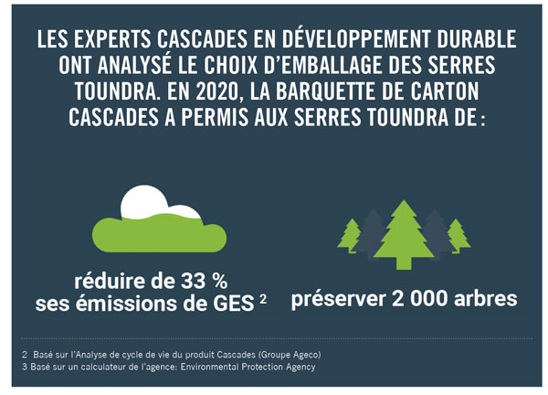 Il n’est donc pas surprenant que la clientèle des Serres Toundra apprécie que l’emballage soit fait de fibres à 100 % recyclées et soit recyclable/compostable. D’ailleurs, des sondages conduits par Cascades auprès de consommateurs démontrent que le carton est perçu plus écoresponsable que tout autre matériau d’emballage alimentaire.